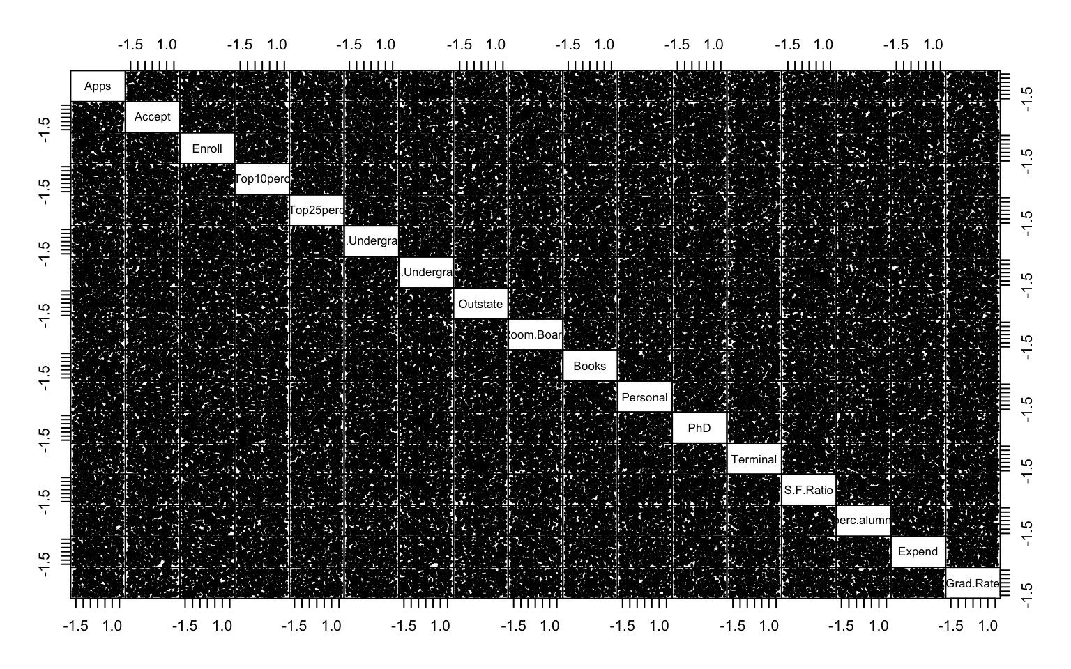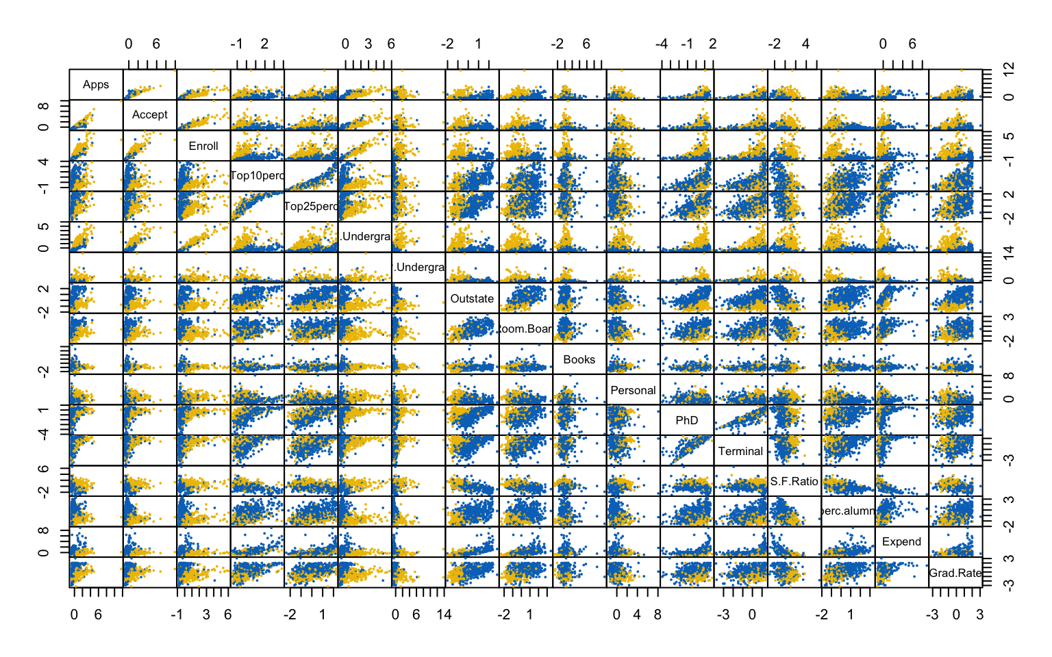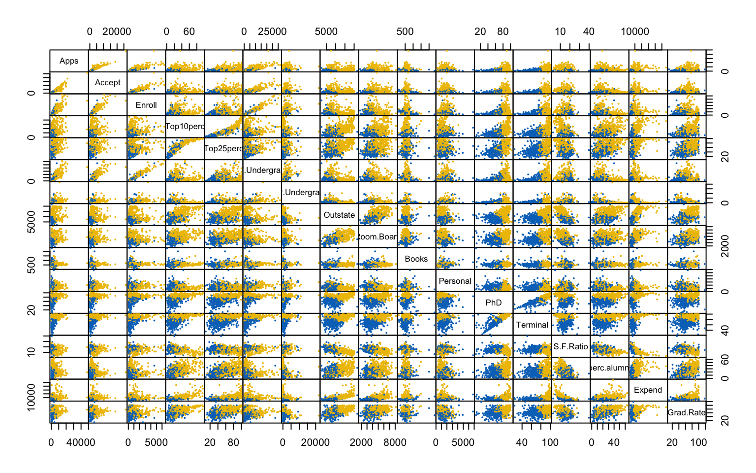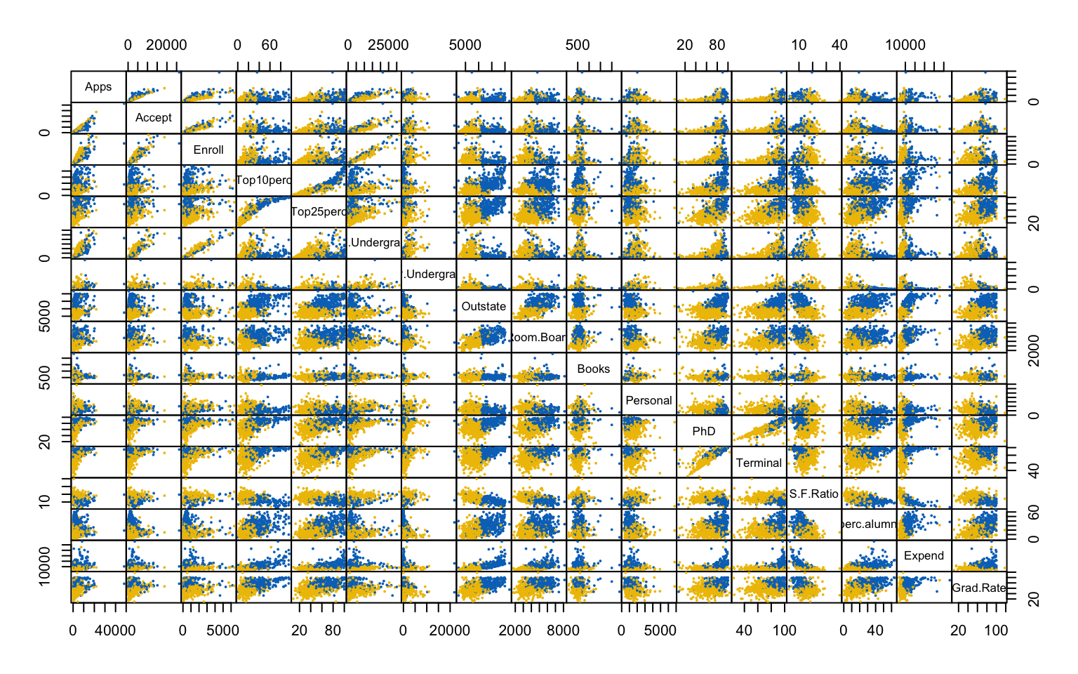 | Private | Apps | Accept | Enroll | Top10perc | Top25perc | F.Undergrad | P.Undergrad | Outstate | Room.Board | Books | Personal | PhD | Terminal | S.F.Ratio | perc.alumni | Expend | Grad.Rate | |