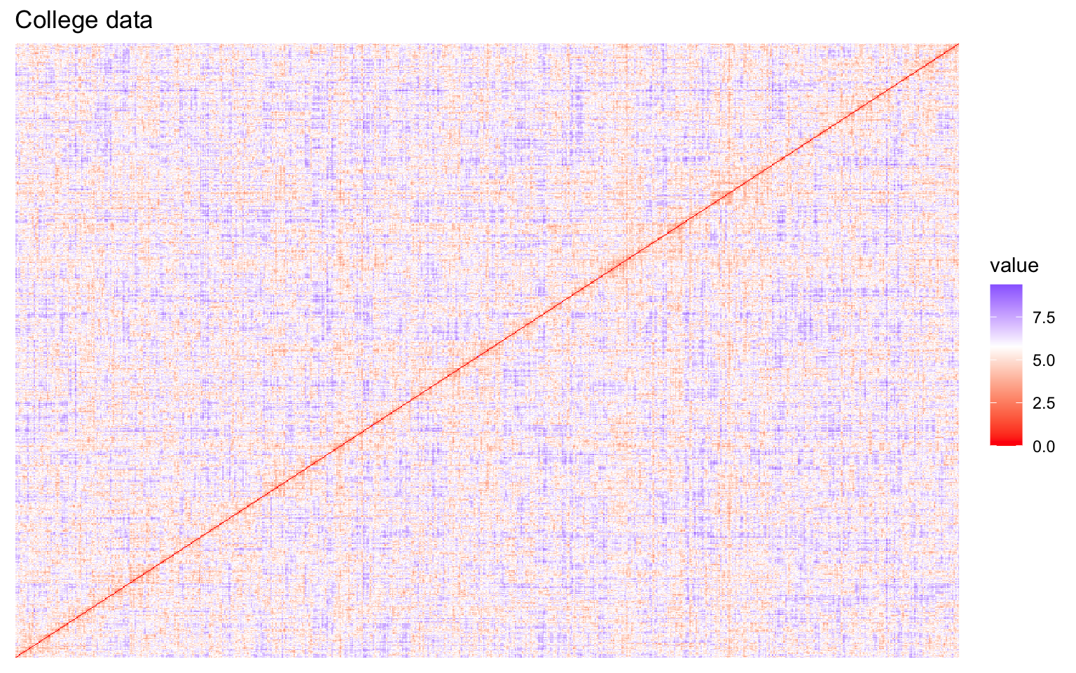 This first part investigates the feasibility of clustering by means of several exploratory techniques. Specifically, scatter plots of the variables colored according to the binary variable Private are compared with scatter plots generated from random values, in order to assess the presence of non-random patterns. The analysis is then extended to the first two principal components obtained via PCA. To further explore the correlation structure among observations, the VAT (Visual Assessment of Tendency) algorithm is applied, and the Hopkins statistic is computed to measure the clustering tendency of the dataset.