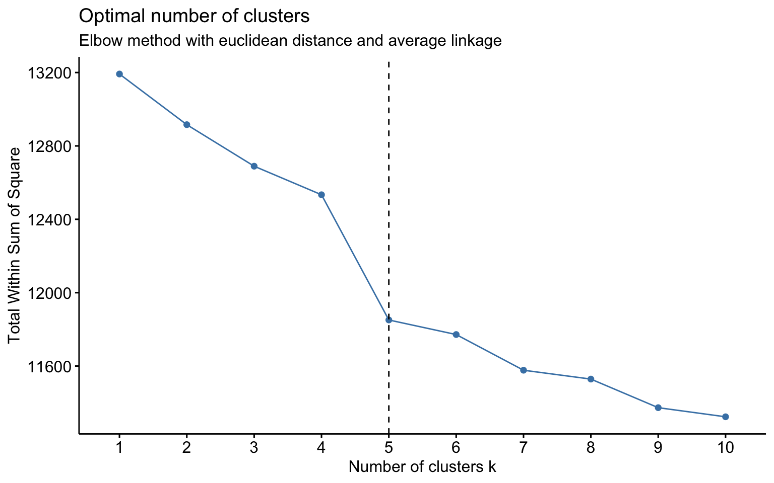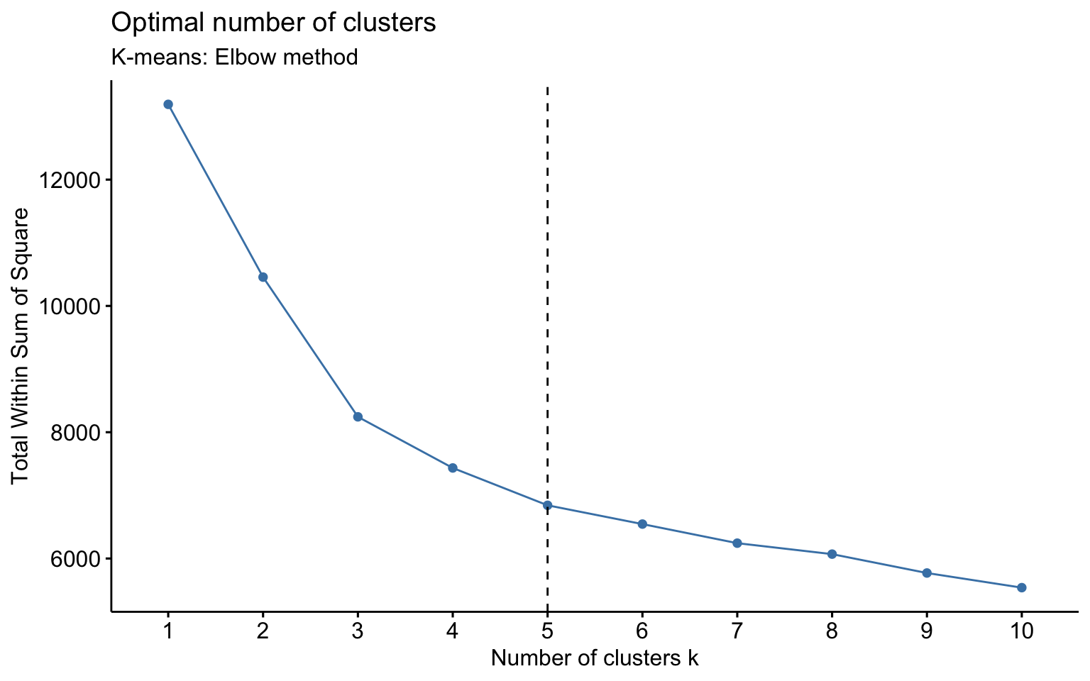 Here, the elbow method is somewhat difficult to interpret because there is no clear gap, and the resulting plot (on the right) is not satisfactory.
