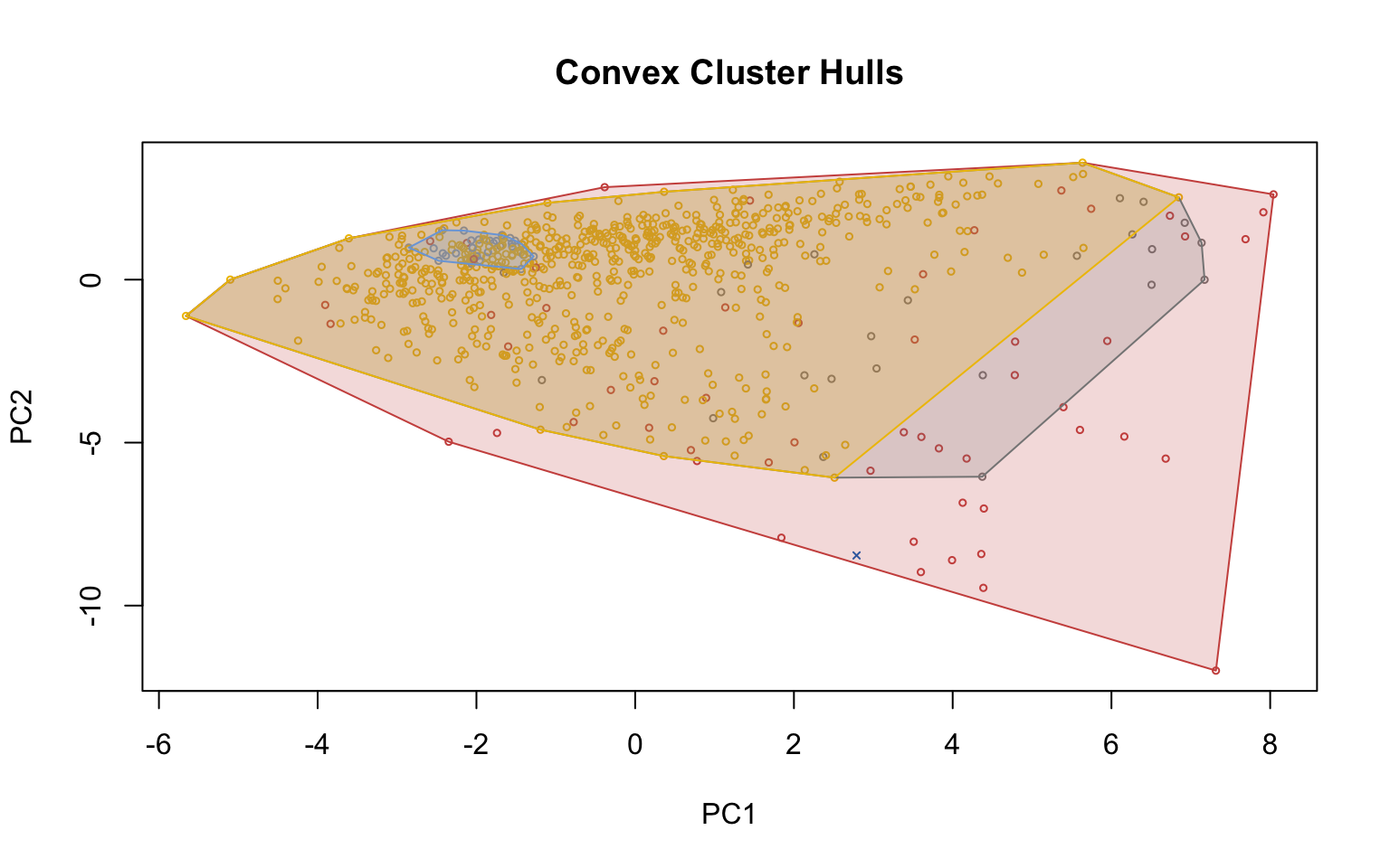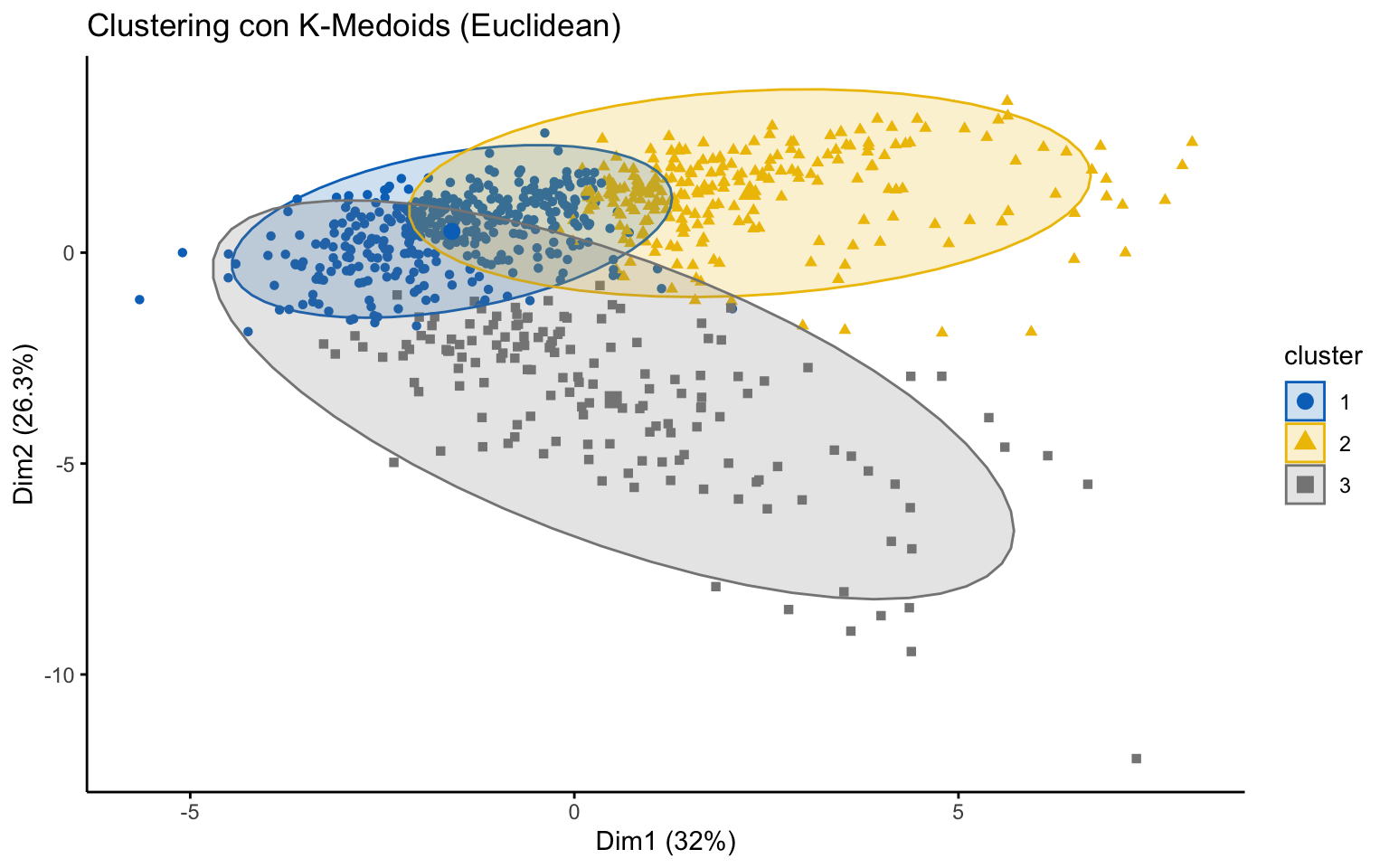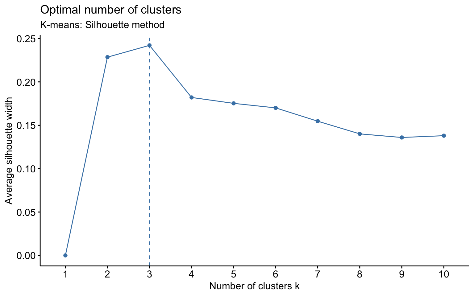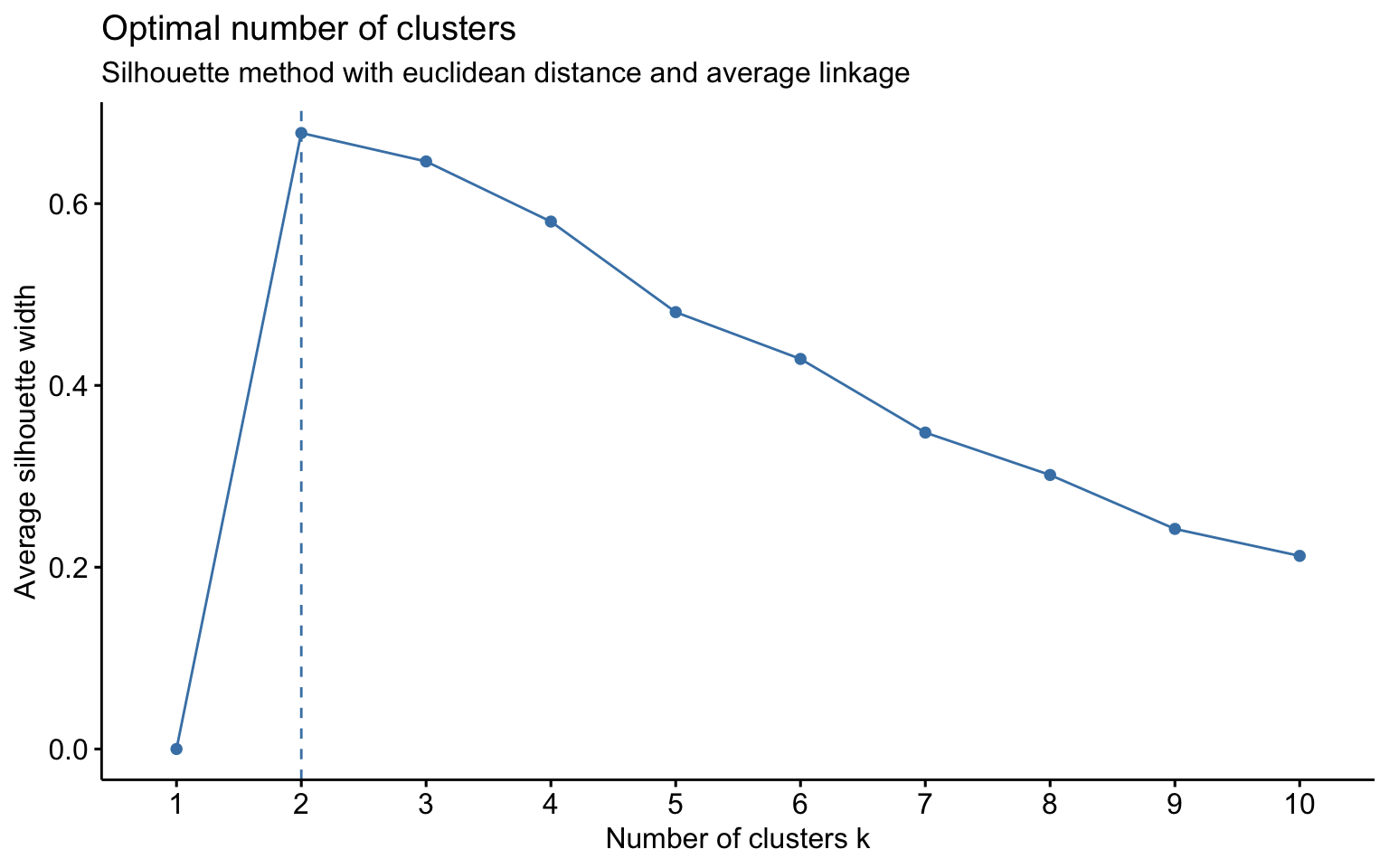 From these stability measures, we can see that the most stable clustering algorithms are HC with Euclidean distance and average linkage (\(k=2\)), and K-means (\(k=3\)). However, the first solution yields only two clusters (with one of them has only one element). Therefore, K-means with \(k=3\) is preferable.