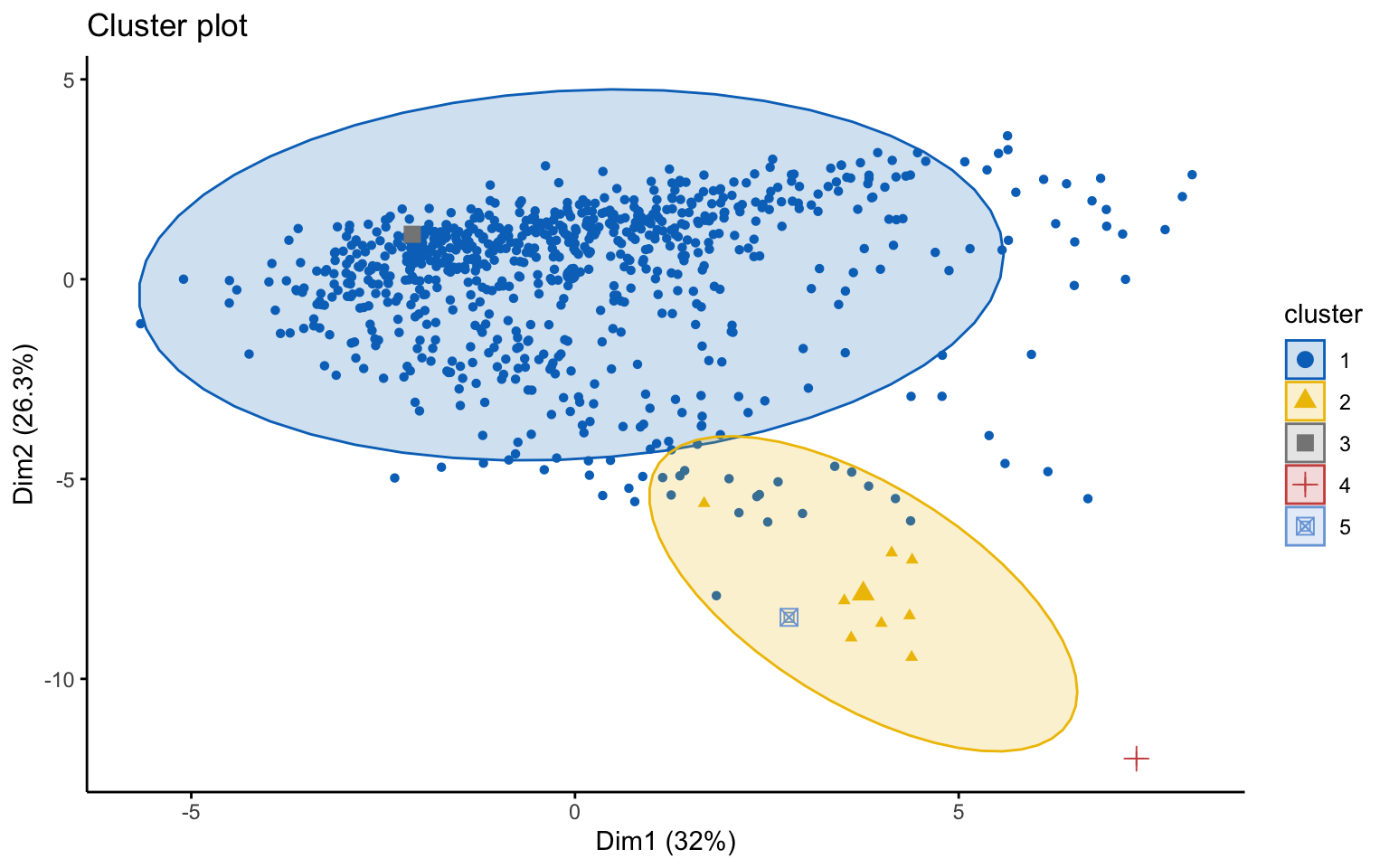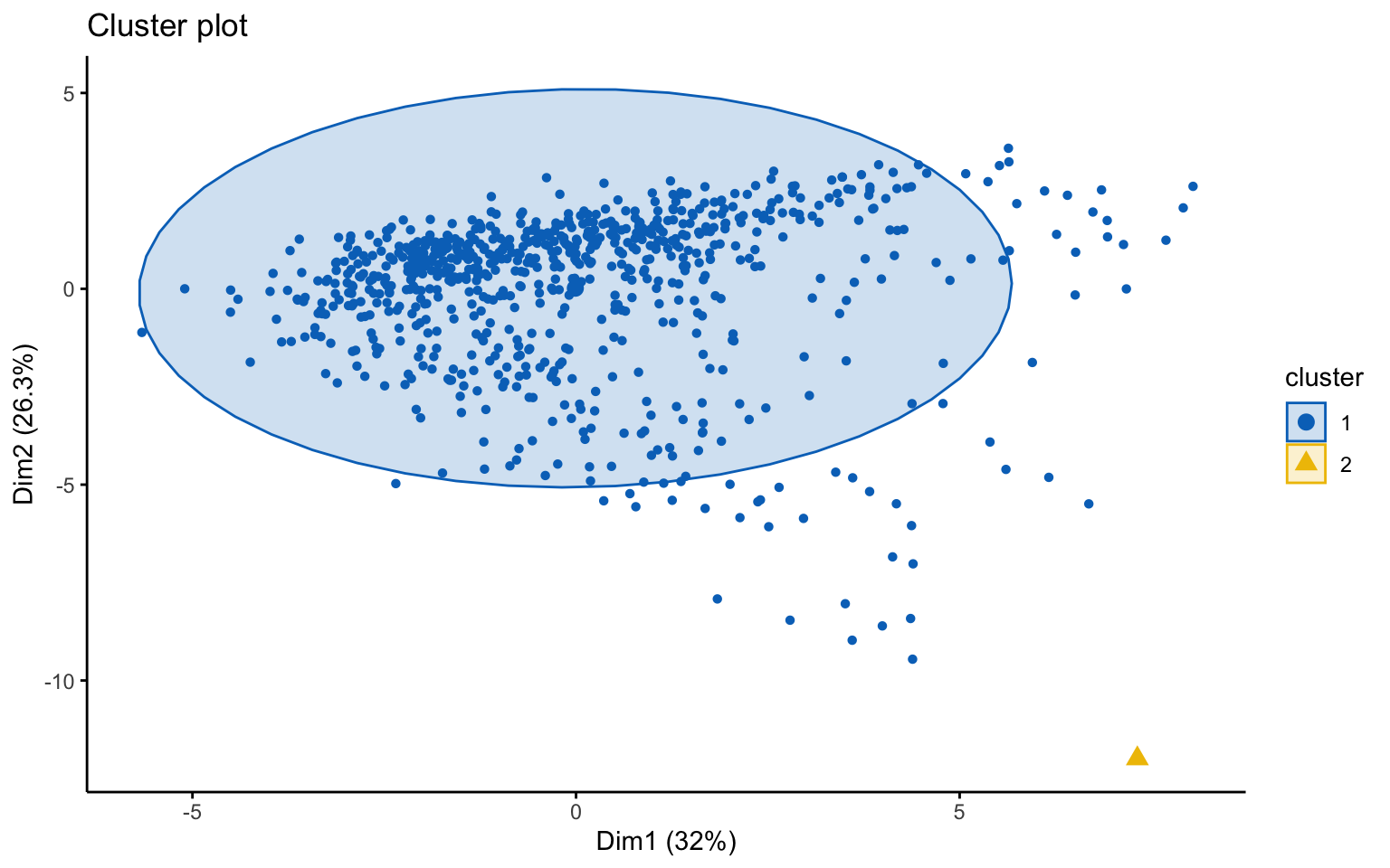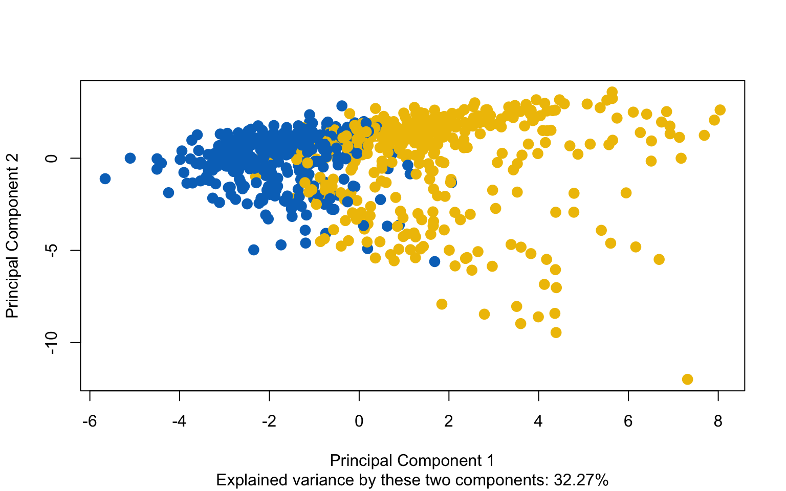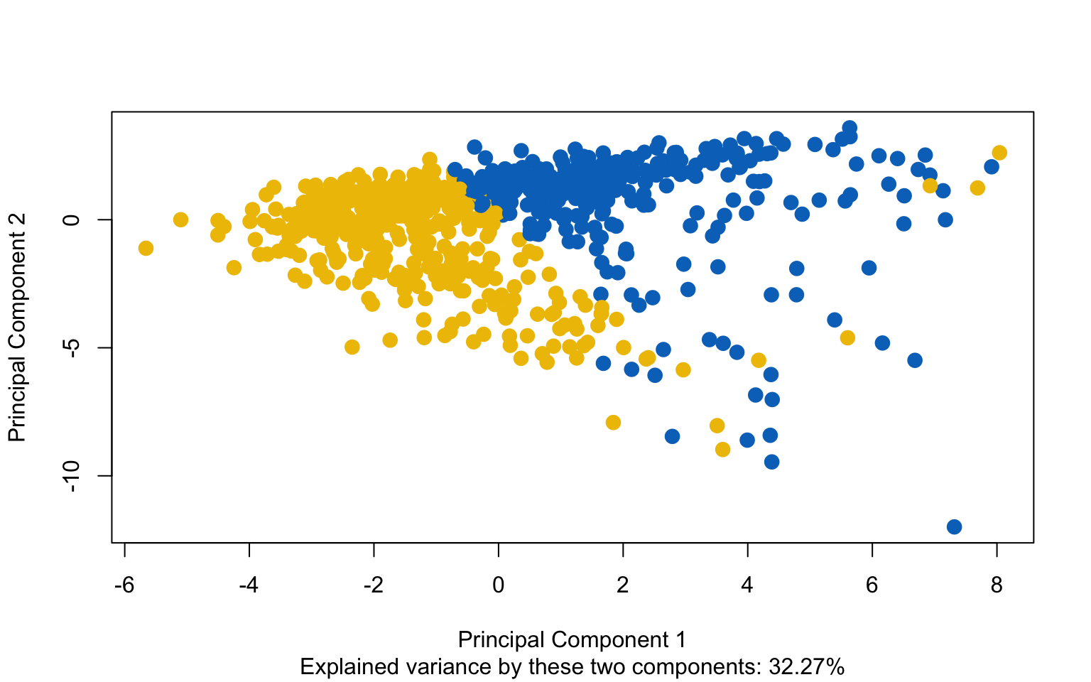 Classic k-means with \(k = 3\) performs better than hierarchical clustering, but it is still difficult to clearly distinguish three separate clusters. It should also be noted that the total variance explained by the first two principal components is relatively low.
