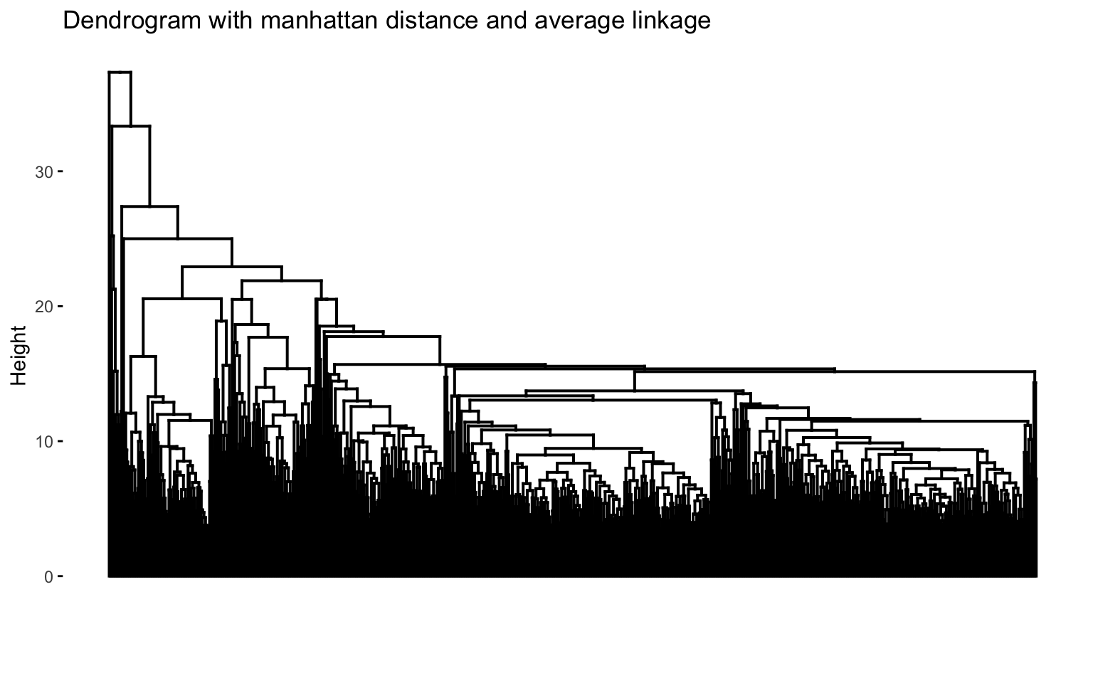Based on the results, the hierarchical clusterings with manhattan distance and the average linkage method, for k = 2 or k = 8, do not yield meaningful results.