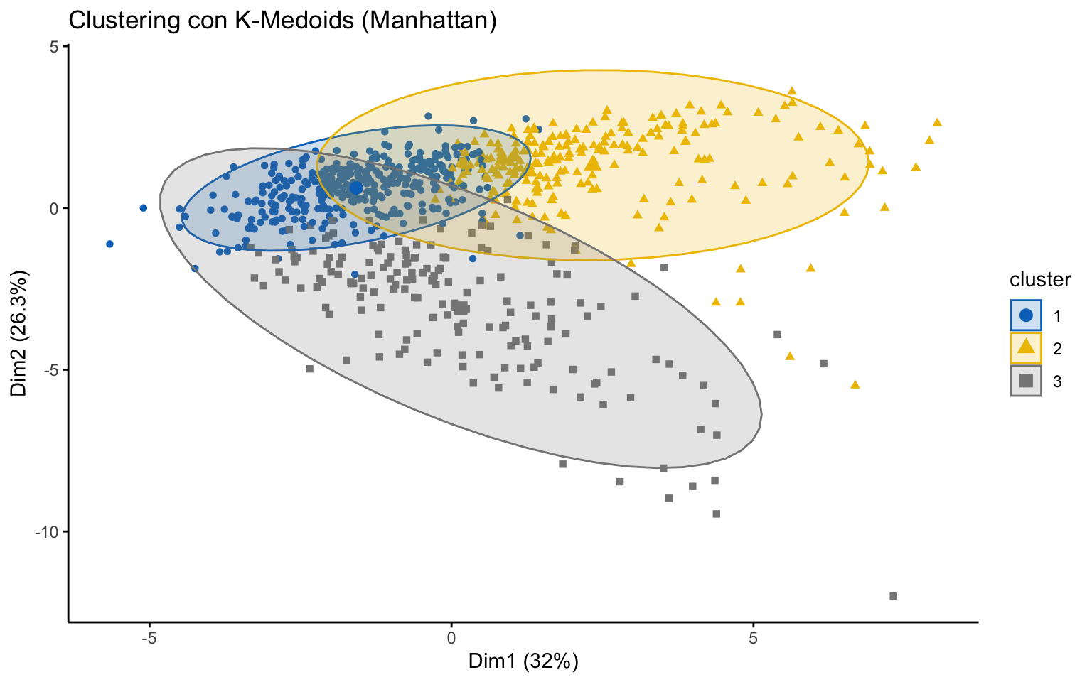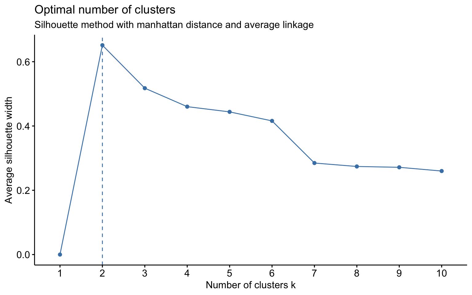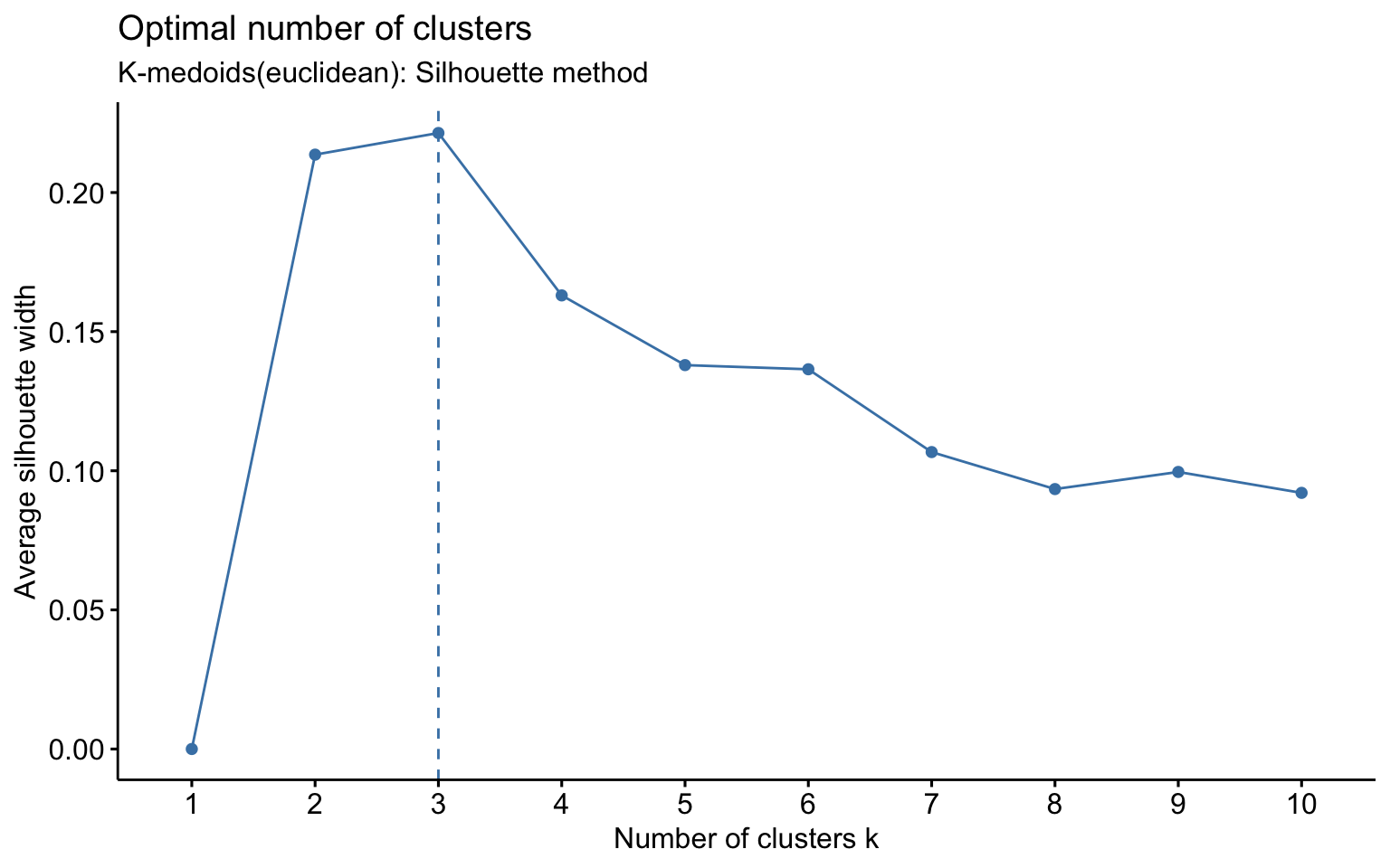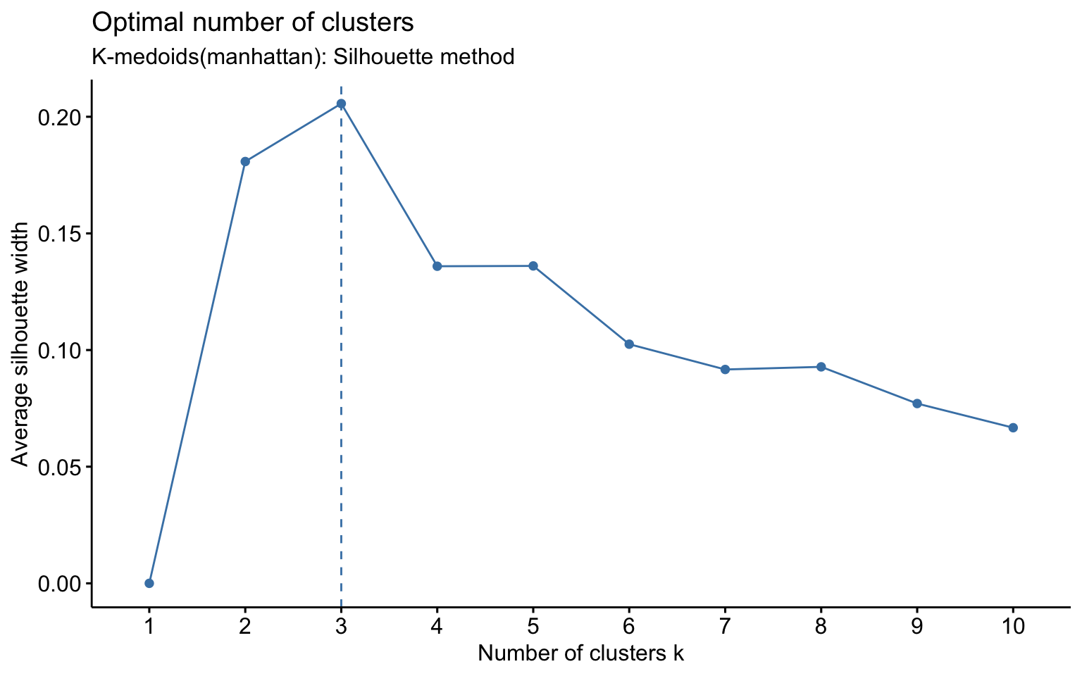 The K-medoids algorithm is more robust to outliers, and when using the Manhattan distance instead of the Euclidean distance, it yields better results in terms of the average silhouette width.