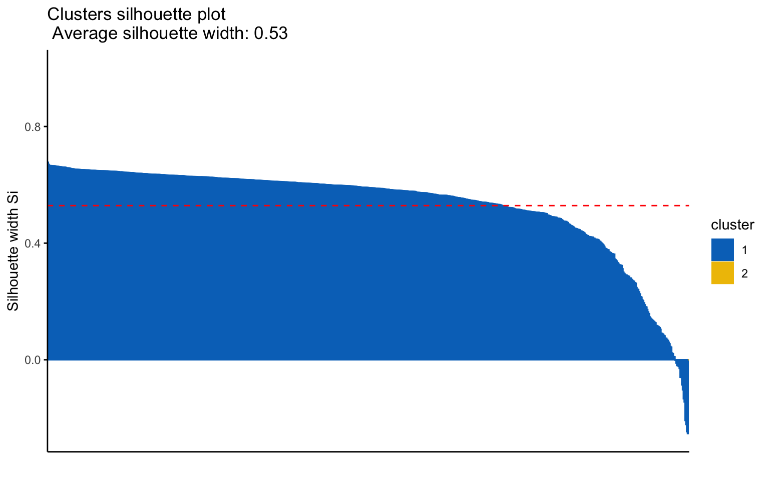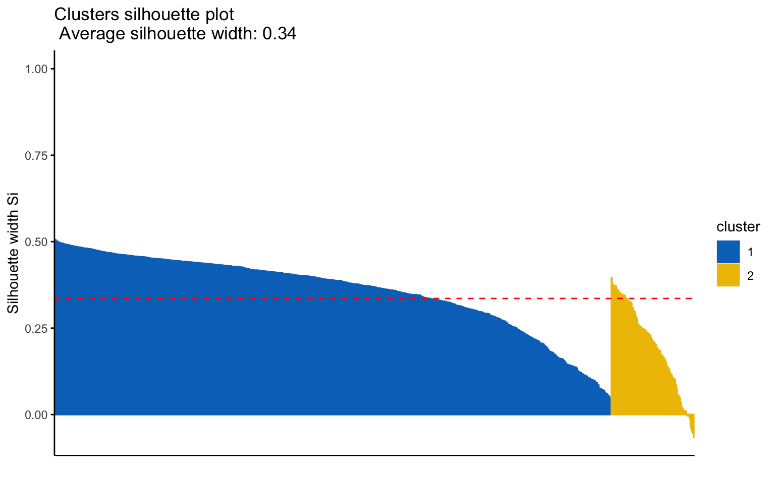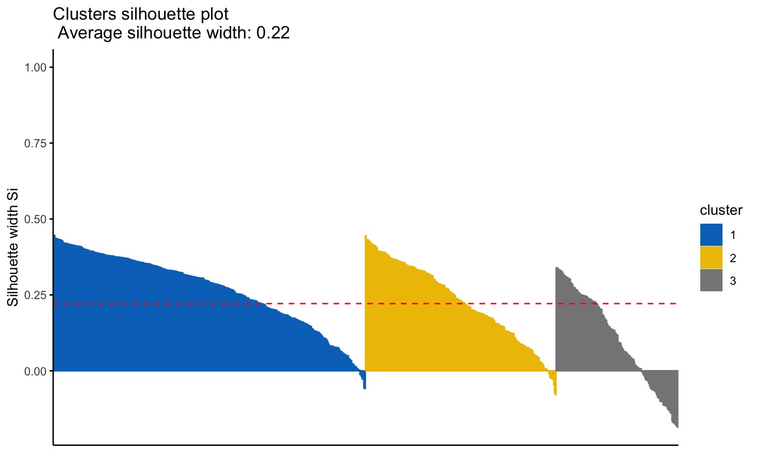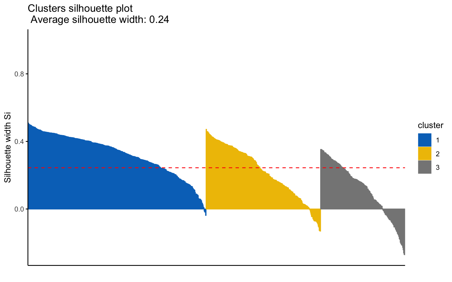 The silhouette plot shows that the elements within each cluster do not achieve a high silhouette score.