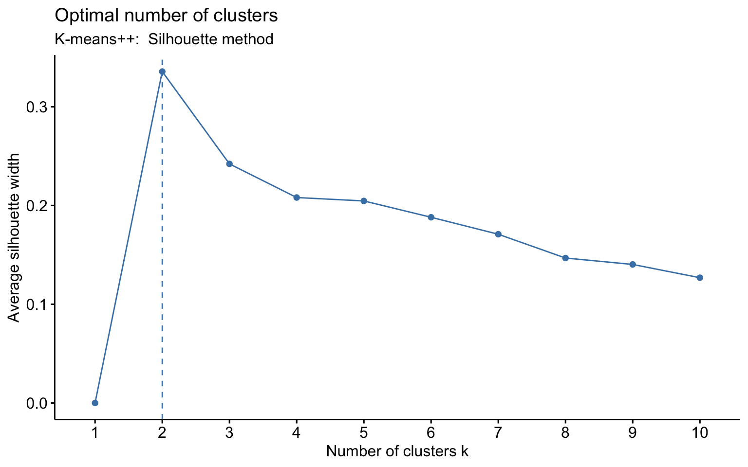 Finally, we should choose between k-means with \(k=3\) and k-means++ with \(k=2\).