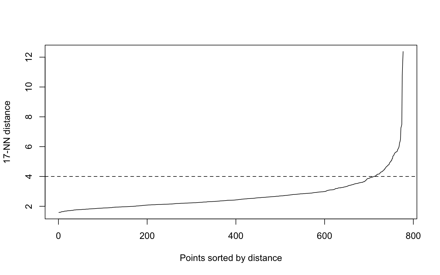 eps: A suitable neighborhood size parameter eps given a fixed value for minPts can be found visually by inspecting the kNNdistplot() of the data using \(k=minPts−1\) (minPts includes the point itself, while the k-nearest neighbors distance does not). The k-nearest neighbor distance plot sorts all data points by their k-nearest neighbor distance. A sudden increase of the kNN distance (a knee) indicates that the points to the right are most likely outliers. Choose eps for DBSCAN where the knee is.