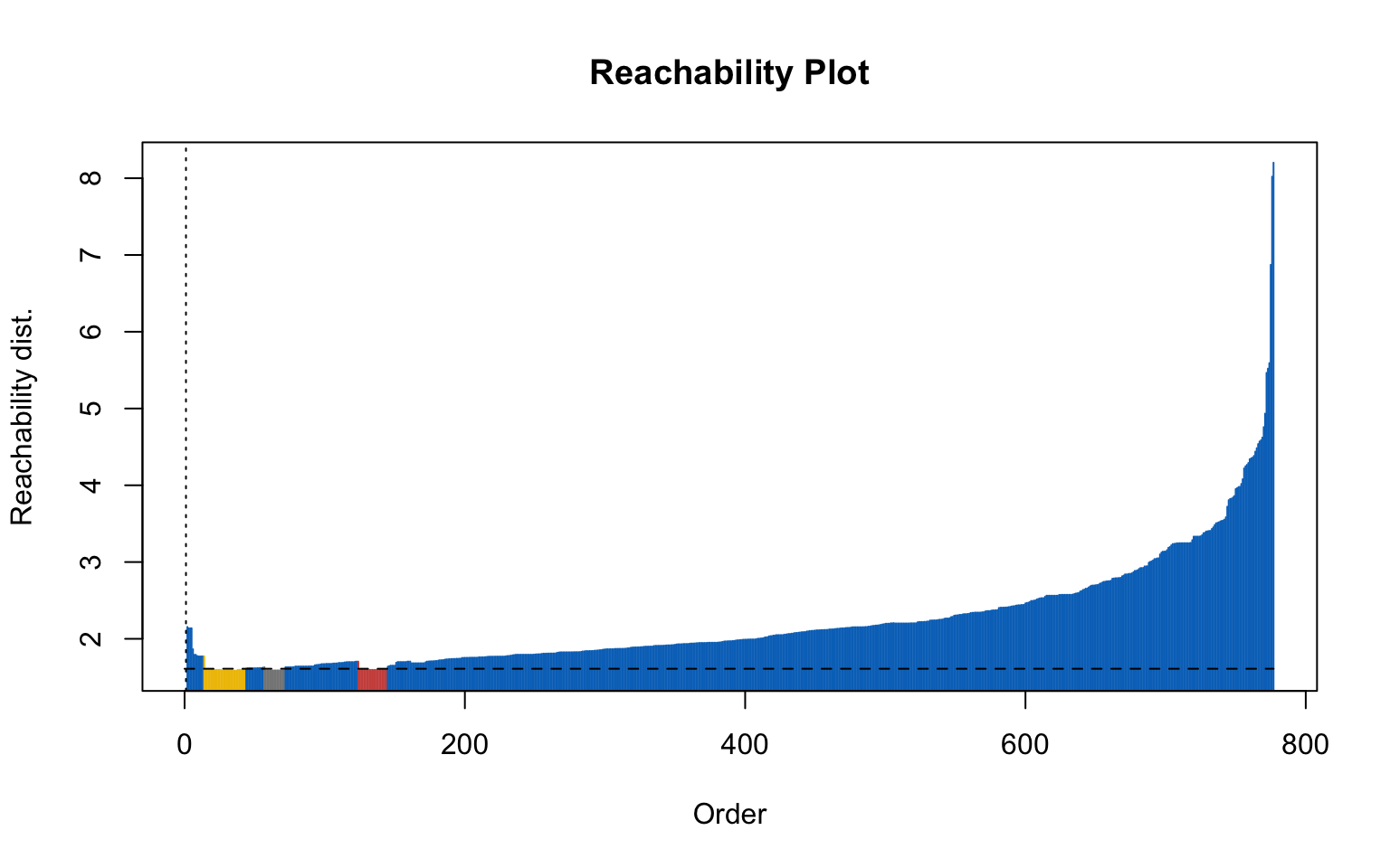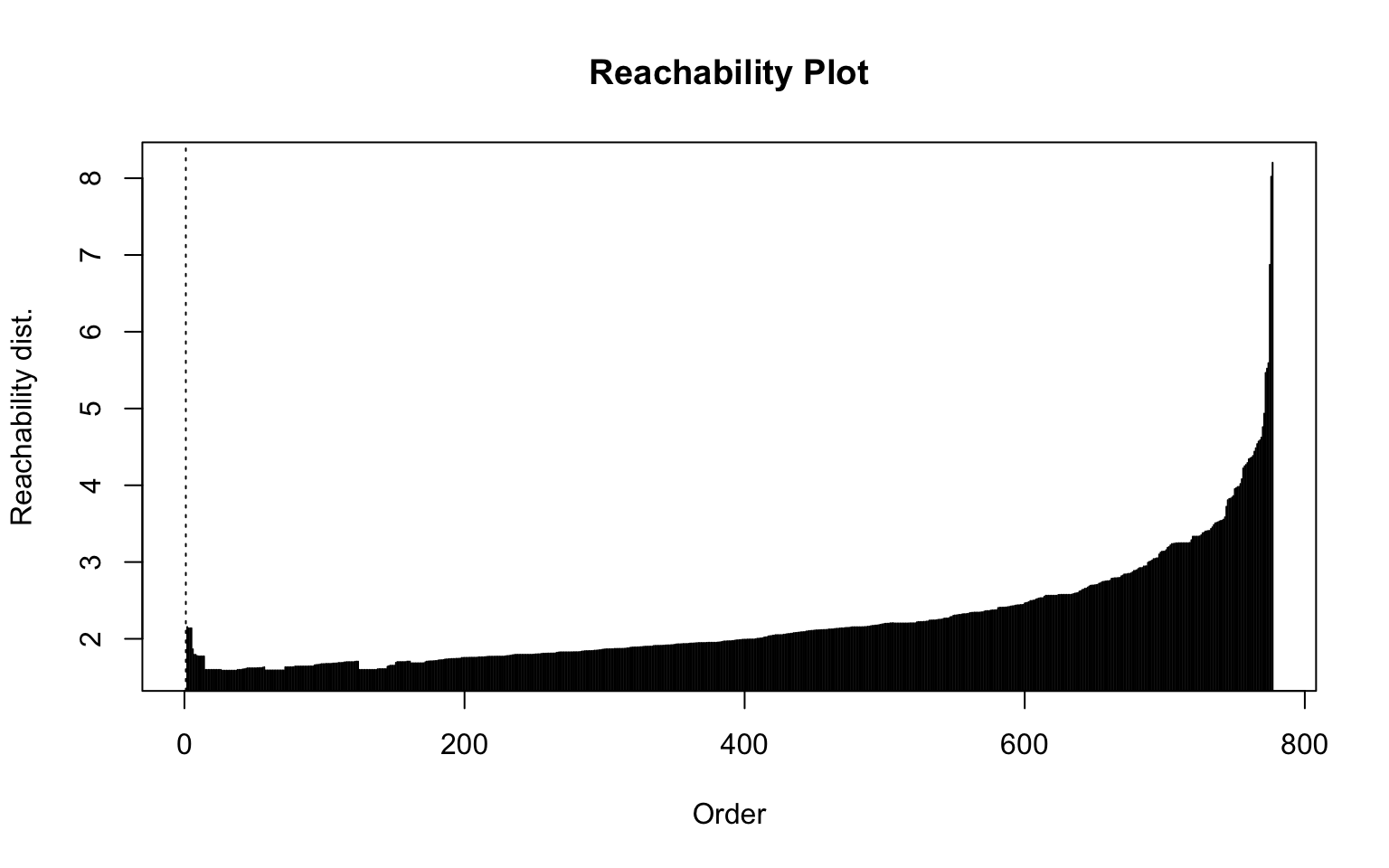 extractDBSCAN()extracts a clustering from an OPTICS ordering that is similar to what DBSCAN would produce with an eps set to eps_cl (see Ankerst et al, 1999). The only difference to a DBSCAN clustering is that OPTICS is not able to assign some border points and reports them instead as noise.extractXi()extract clusters hierarchically specified in Ankerst et al (1999) based on the steepness of the reachability plot. One interpretation of the xi parameter is that it classifies clusters by change in relative cluster density. The used algorithm was originally contributed by the ELKI framework and is explained in Schubert et al (2018), but contains a set of fixes.