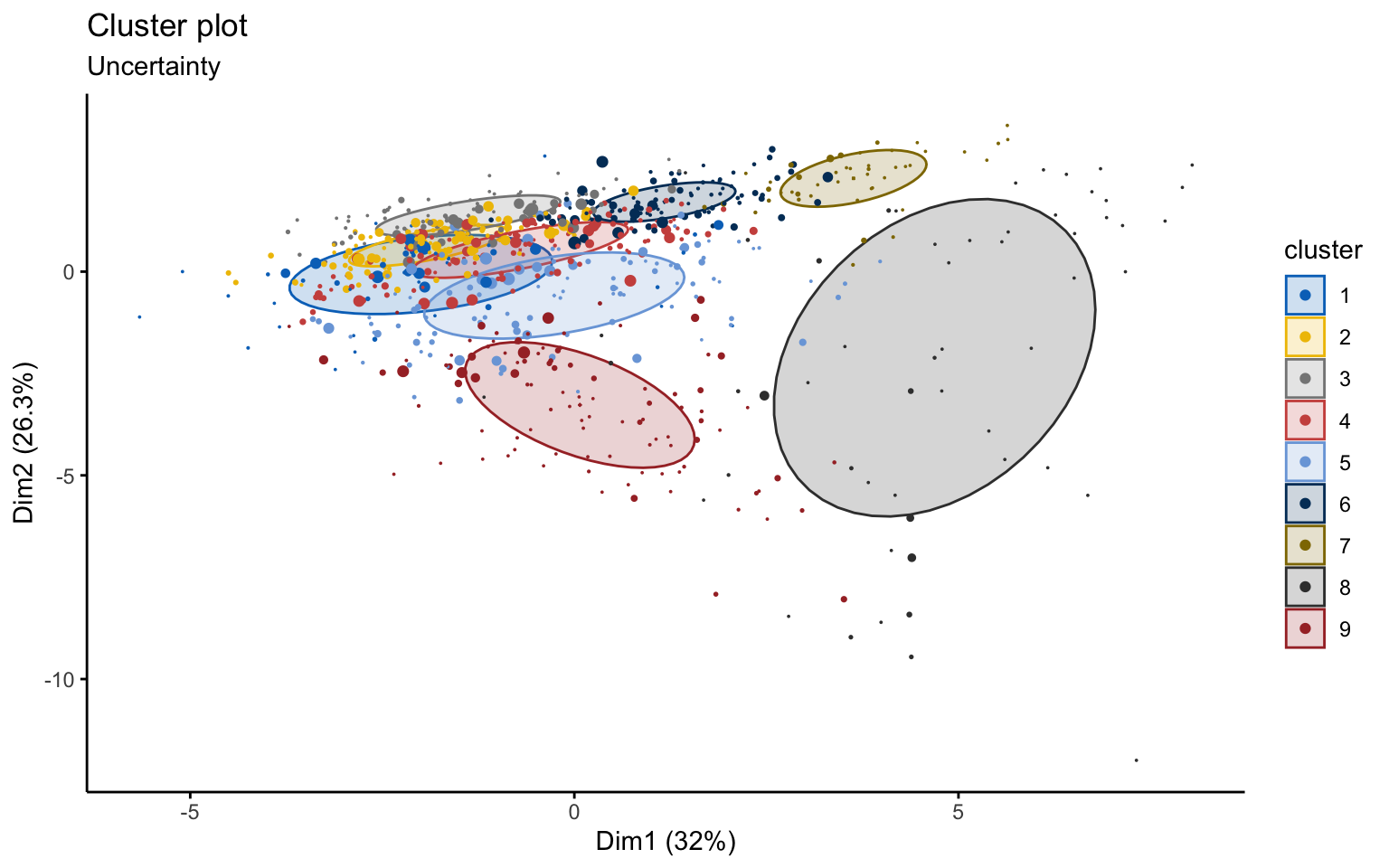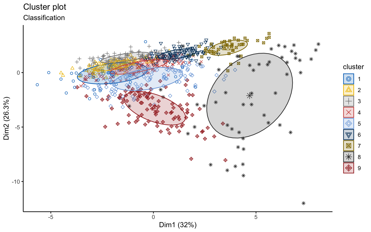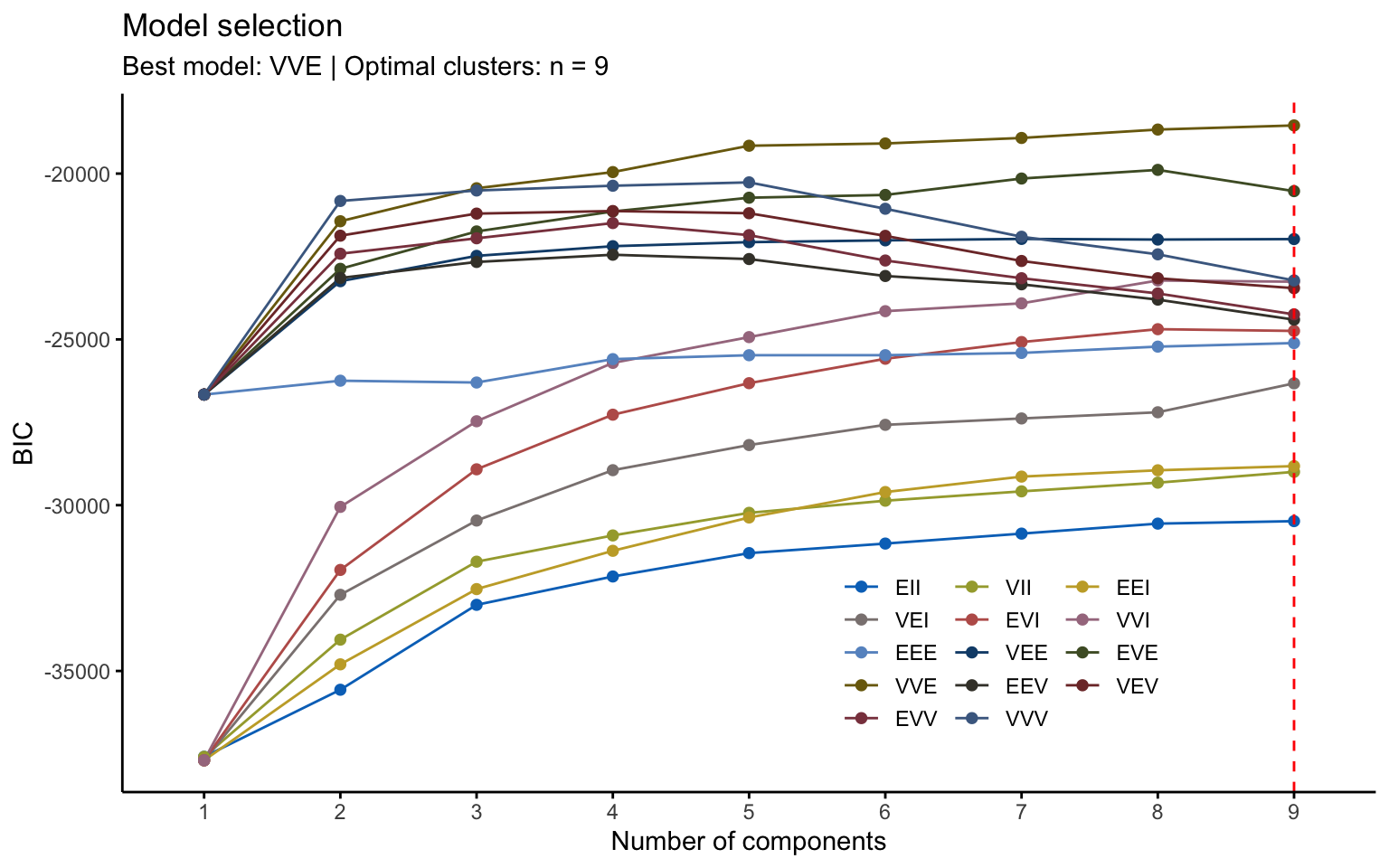 Using the Mclust function, the best model selected is VVE, which corresponds to clusters with variable volume and shape but equal orientation, with \(k=9\).